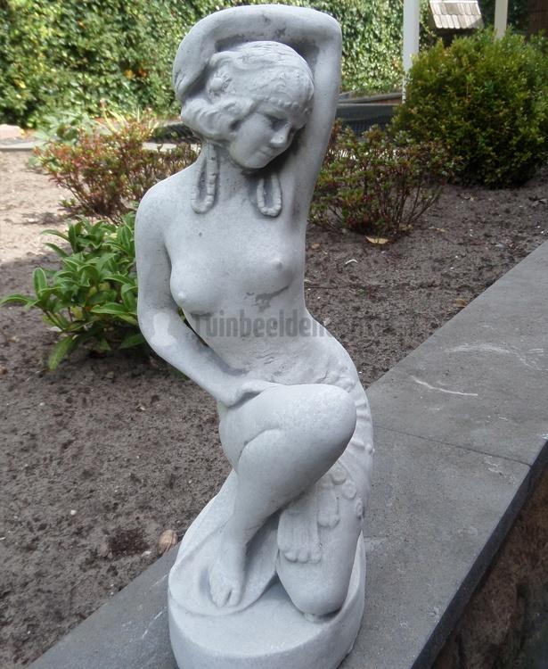 Sierlijk en sfeervol beeld van een sensuele vrouw met ontbloot bovenlichaam. Dit middelgrote beeld van 37 cm is gemaakt van massief beton en gepatineerd afgewerkt. Hierdoor komen de prachtige en gedetailleerde contouren nog beter tot zijn recht. Het beeld is geschikt om het gehele jaar buiten te laten staan, ook met vorst. Door het compacte formaat en klasse uitstraling ook prima geschikt als huisdecoratie.