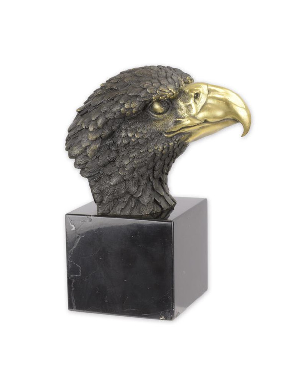 Ontdek de majestueuze bronzen adelaarskop, een indrukwekkend beeld dat kracht en elegantie uitstraalt. Dit kunstwerk is met de hand vervaardigd uit hoogwaardig brons, wat zorgt voor een duurzame en luxe uitstraling. De gedetailleerde afwerking vangt de essentie van de adelaar perfect, van de scherpe blik tot de verfijnde verenstructuur. Dit beeld is niet alleen een eerbetoon aan de koning van de lucht, maar ook een tijdloze toevoeging aan je interieur of tuin. Het robuuste materiaal maakt het bestand tegen de elementen, waardoor het zowel binnen als buiten een blikvanger is. Plaats het op een prominente plek en laat het de aandacht trekken van iedereen die binnenkomt. Met deze bronzen adelaarskop haal je niet zomaar een decoratief stuk in huis, maar een symbool van vrijheid en kracht.Specificaties