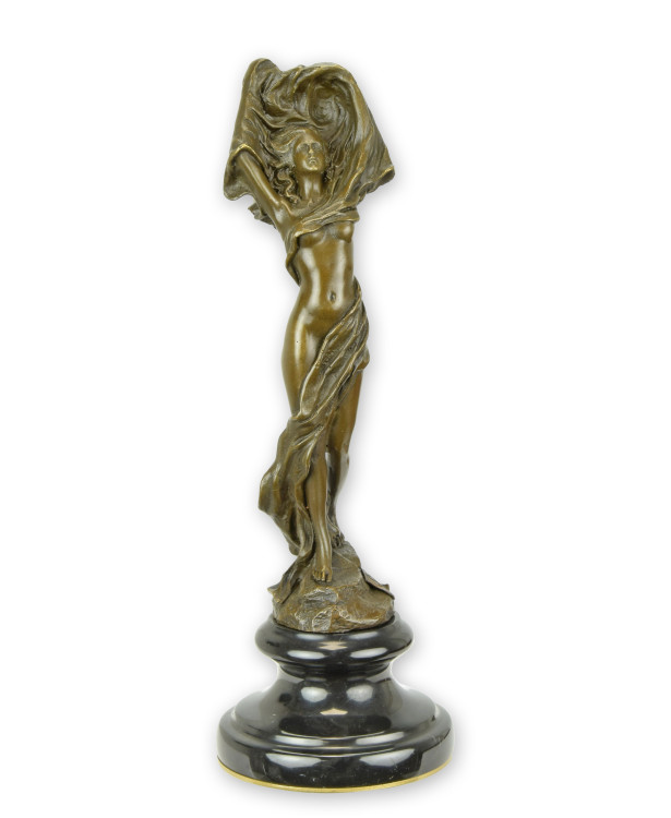 Dit elegante bronzen beeld toont een gracieuze sluierdanseres in beweging. De fijne details van de vloegende sluier en de expressieve houding maken dit beeld tot een prachtige blikvanger voor je interieur. Het beeld is vakkundig vervaardigd van duurzaam brons en wordt geleverd met een decoratieve messing plaat eronder. Perfect voor je woonkamer, studeerkamer of hal.Specificaties