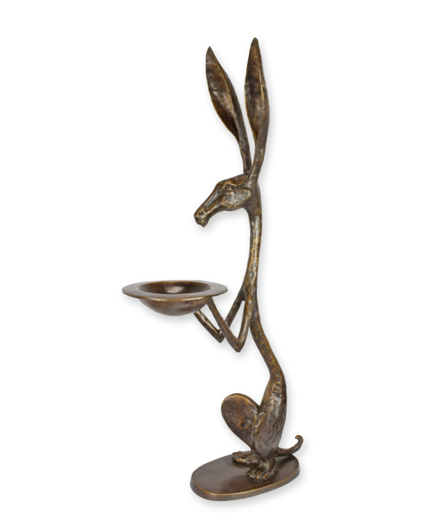 Ontdek het bronzen beeld van een haas met een dienblad, een unieke toevoeging aan je interieur. Dit kunstwerk combineert elegantie met functionaliteit, waardoor het niet alleen een visueel spektakel is, maar ook praktisch inzetbaar. Gemaakt van hoogwaardig brons, straalt het beeld duurzaamheid en luxe uit. De haas, met zijn verfijnde details en levendige uitstraling, lijkt bijna tot leven te komen. Het dienblad biedt ruimte voor kleine voorwerpen, waardoor het beeld niet alleen een decoratief stuk is, maar ook een handige plek voor sleutels of sieraden. De warme, glanzende afwerking van het brons voegt een vleugje klasse toe aan elke kamer. Dit beeld is perfect voor wie houdt van kunst met een twist en een vleugje humor in huis wil brengen. Laat je verrassen door de charme en veelzijdigheid van dit bijzondere kunstwerk.Specificaties