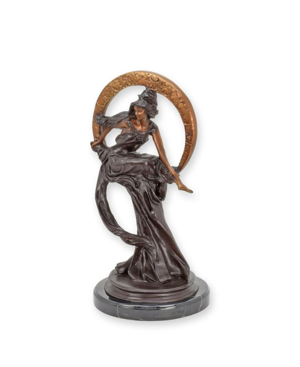 Bronzen vrouwen beeld zittend op cirkel met marmeren voet