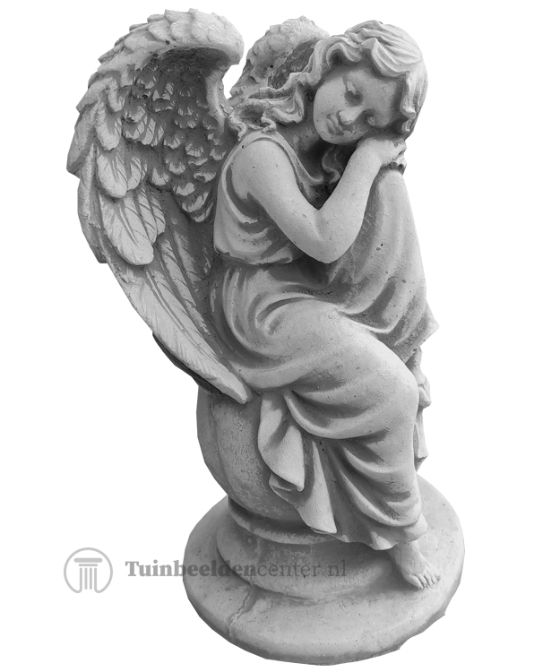 Rustgevend beeld van een slapende engel zittend op een bol. De engel heeft prachtige grote vleugels en lange haren. Engelen staan ook wel bekend als beschermers van de mens en boodschappers van God. Dit betonnen engelenbeeldje is uitermate geschikt als tuindecoratie en herdenkingsbeeld, maar kan ook prima als decoratie binnenshuis dienen. Dankzij de licht gepatineerde afwerking komen de vele details bijvoorbeeld bij de vleugels nog beter tot hun recht. U kunt het gerust alle seizoenen buiten laten staan. Door het relatief hoge gewicht staat het erg stevig. Het beton is daarnaast winterhard.