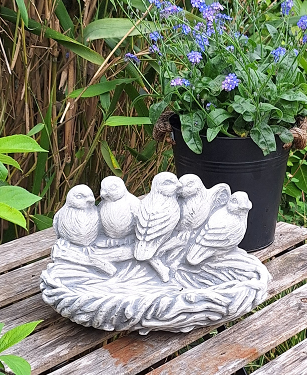 Een mooie en compacte vogeldrinkschaal of vogelbad type Bella met een lengte van 27 cm. Deze drinkschaal is voorzien van vele details, waaronder vijf vogels die op de rand zitten. Een prachtig tafereel helemaal wanneer er echte vogeltjes komen drinken en baden. Dit ornament is gemaakt van winterhard beton en geschikt om alle seizoenen buiten te laten staan. In de winter is het wel raadzaam om het water uit de schaal te halen i.v.m. uitzetting van het water door vorst.