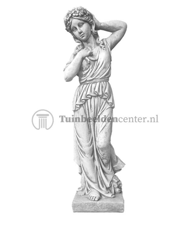 Een prachtig gedetailleerd beeld van een vrouw met een bloemmotief in het haar. Dit beeld heeft een hoogte van 95 cm en is licht gepatineerd afgewerkt, waardoor de vele details erg mooi naar voren komen. Dit sierlijke tuinbeeld is een absolute meerwaarde voor uw tuin, waar u alle seizoenen van kunt genieten. Het beeld is massief gegoten van winterhard sierbeton. Dankzij het hoge eigen gewicht van ongeveer 48 kilo staat het geheel erg stevig.